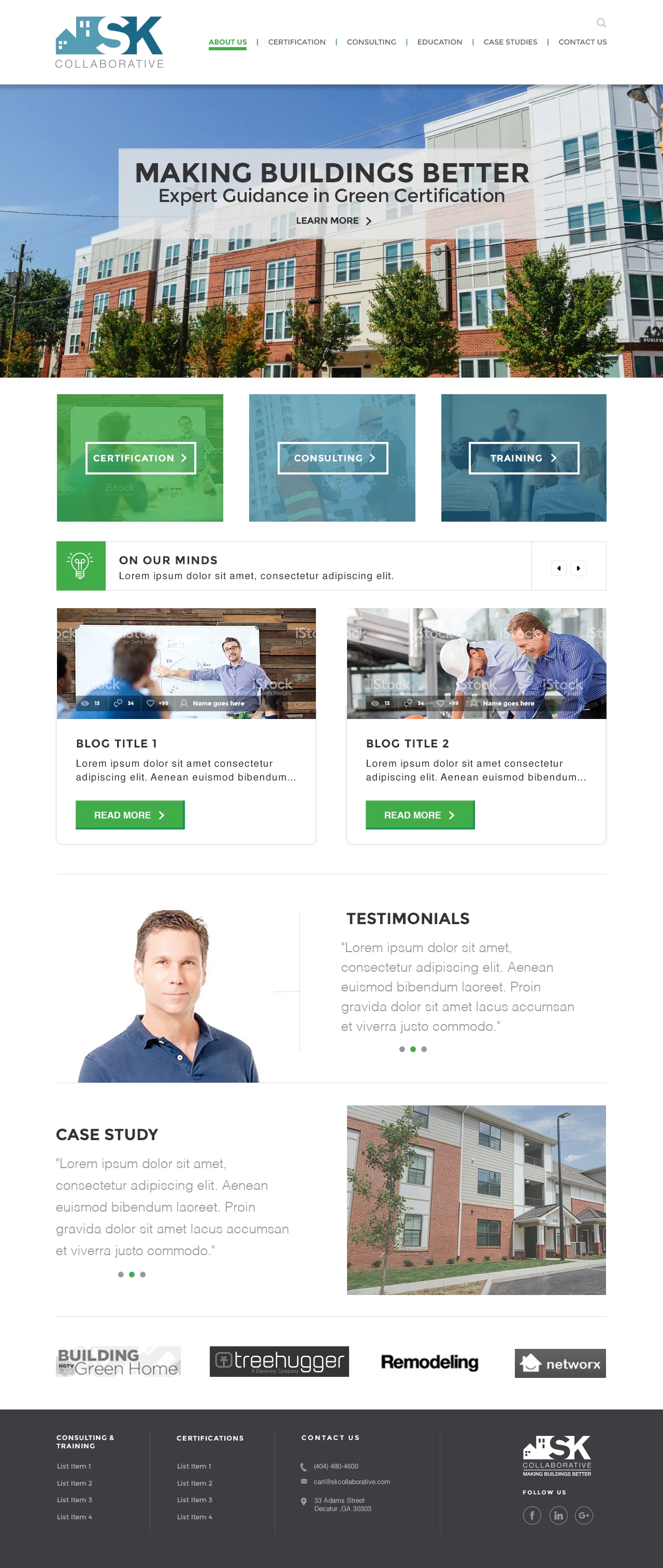 SK Collaborative, based out of Decatur, Georgia specializing in green building construction, certification and training. Partners Marketing Group tasked me with creating a new homepage design and email template for upcoming newsletters.